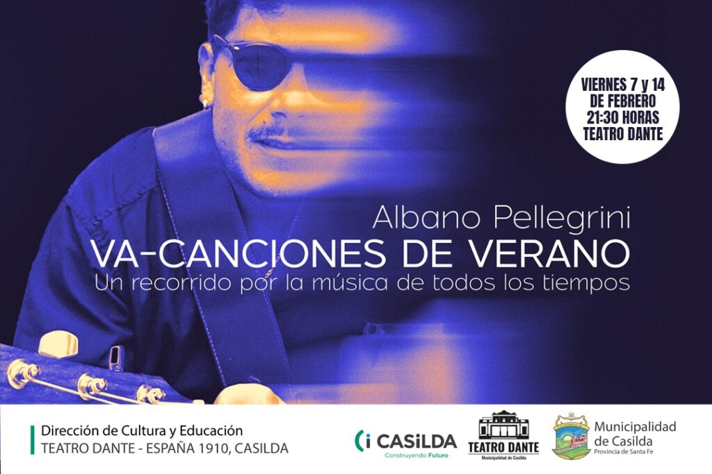 El músico casildense Albano Pellegrini se presentará en el Teatro Dante, con el espectáculo “Va-Canciones de verano: Un recorrido por la música de todos los tiempos”. Las funciones serán dos, los viernes 7 y 14, a partir de las 21,30 hs.