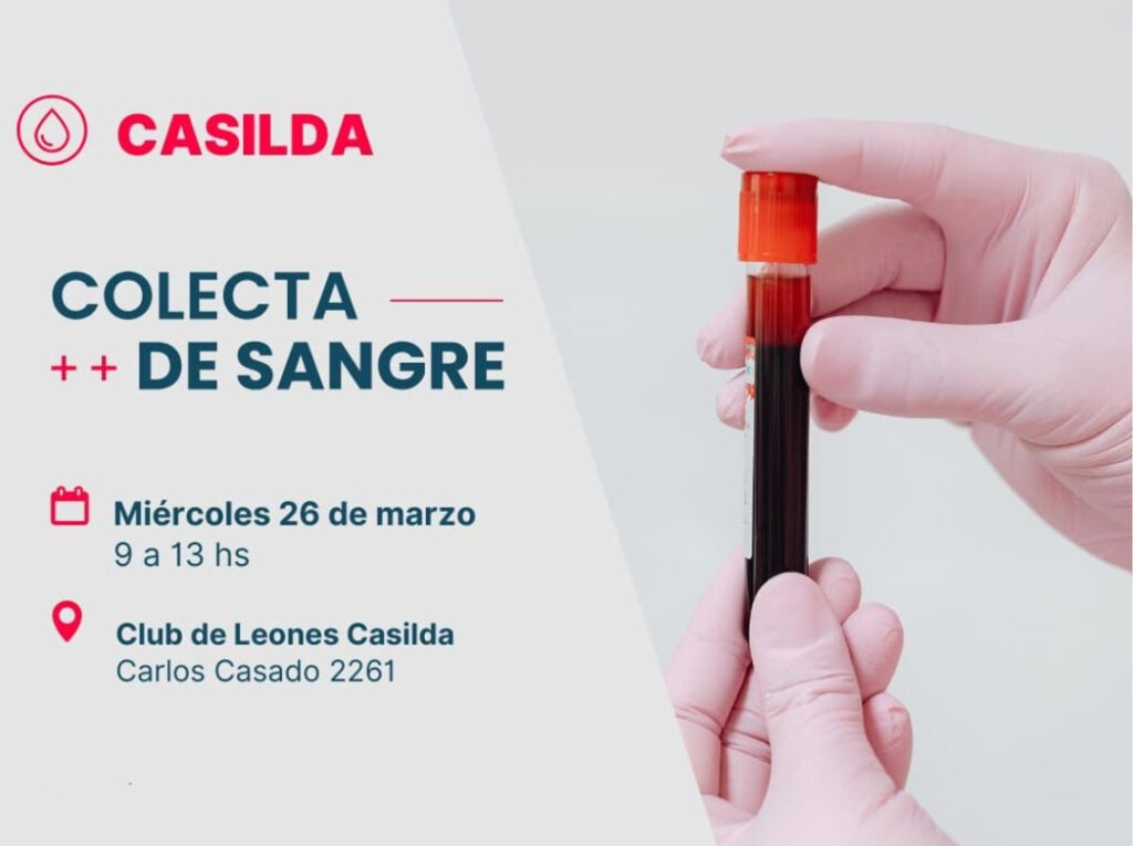 Este miércoles 26, de 9 a 13 hs., se llevará a cabo una colecta de sangre en el Club de Leones de Casilda, sito en calle Casado 2261. Quienes deseen colaborar deben inscribirse en https://docs.google.com/forms/d/e/1FAIpQLSdslXDcJgXFEBrWlaE1ck4t4iUhYefhT_xI6hsJgtCSiTdFgg/viewform
