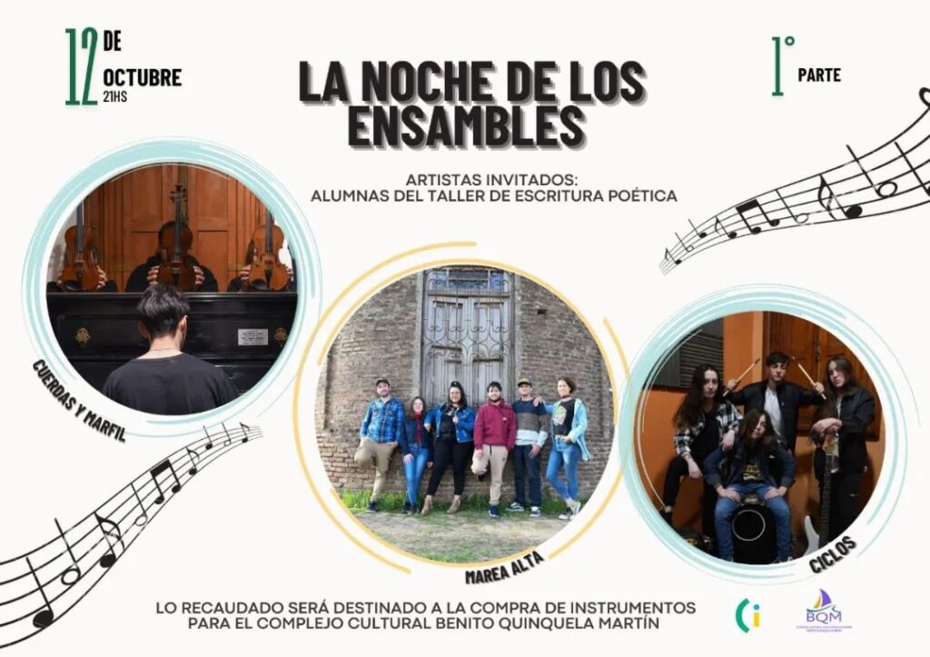 El evento denominado “La Noche de los Ensambles” constará de dos partes: El sábado 12 de octubre, desde las 21 hs., se presentarán: Cuerdas y marfil, Marea alta y Ciclos, con las alumnas del taller de Escritura Poética como artistas invitadas.