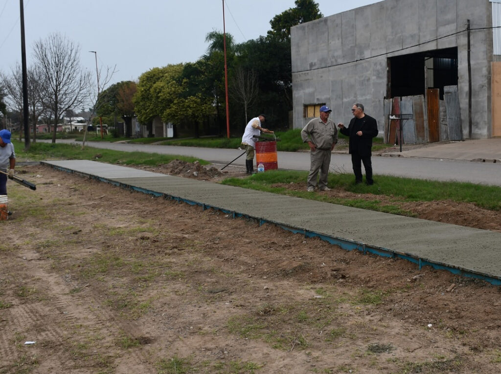 La obra inició con la construcción de las veredas perimetrales en hormigón con terminación raspinada, como parte de una intervención pensada para recuperar y poner en valor sectores clave de la ciudad.